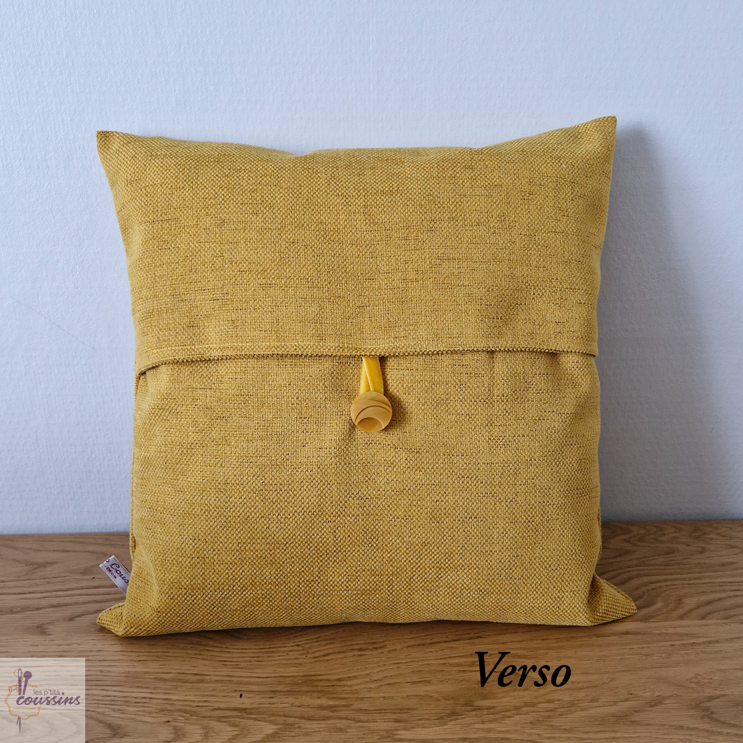 Coussin en velours uni jaune safran, le dos est en fermeture portefeuille avec lien de velours et bouton assorti.