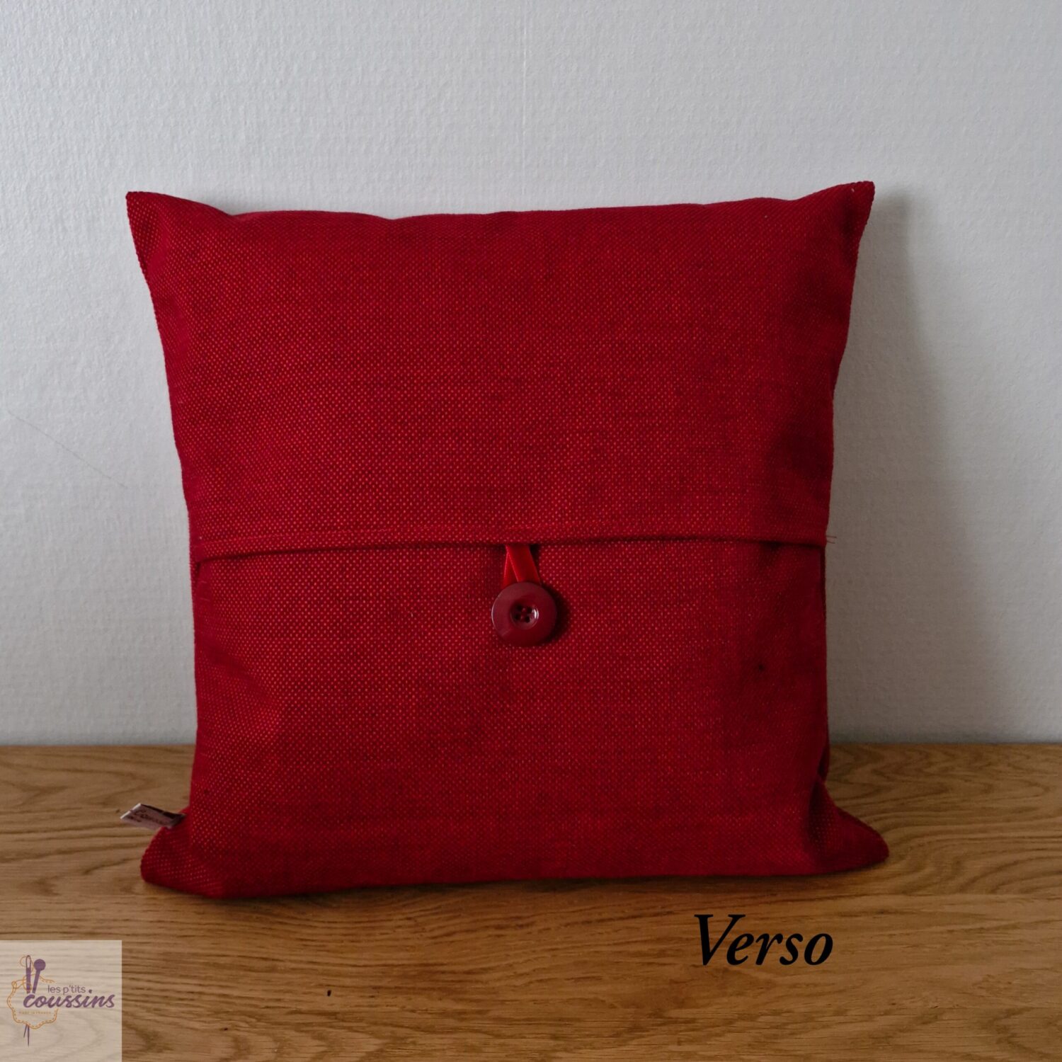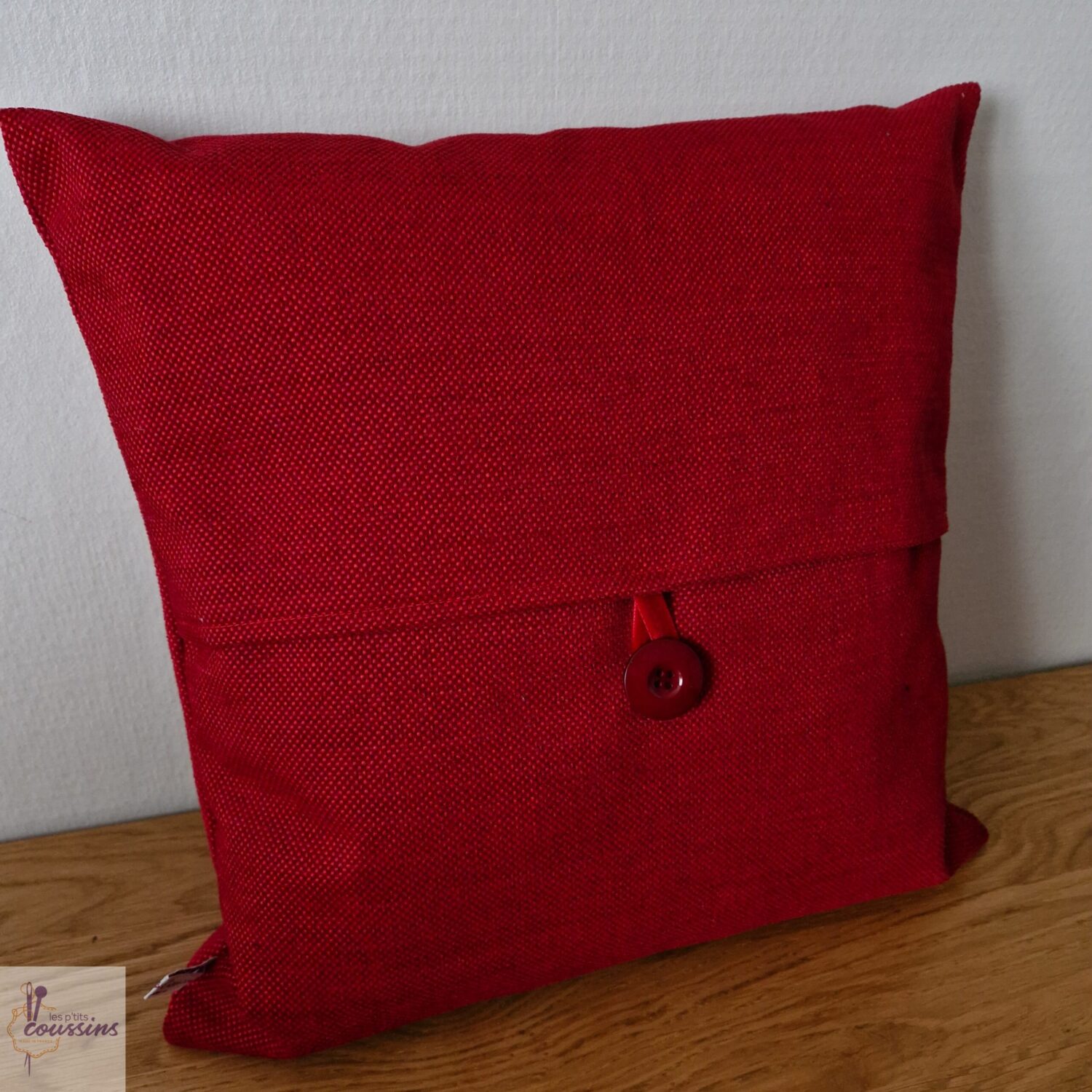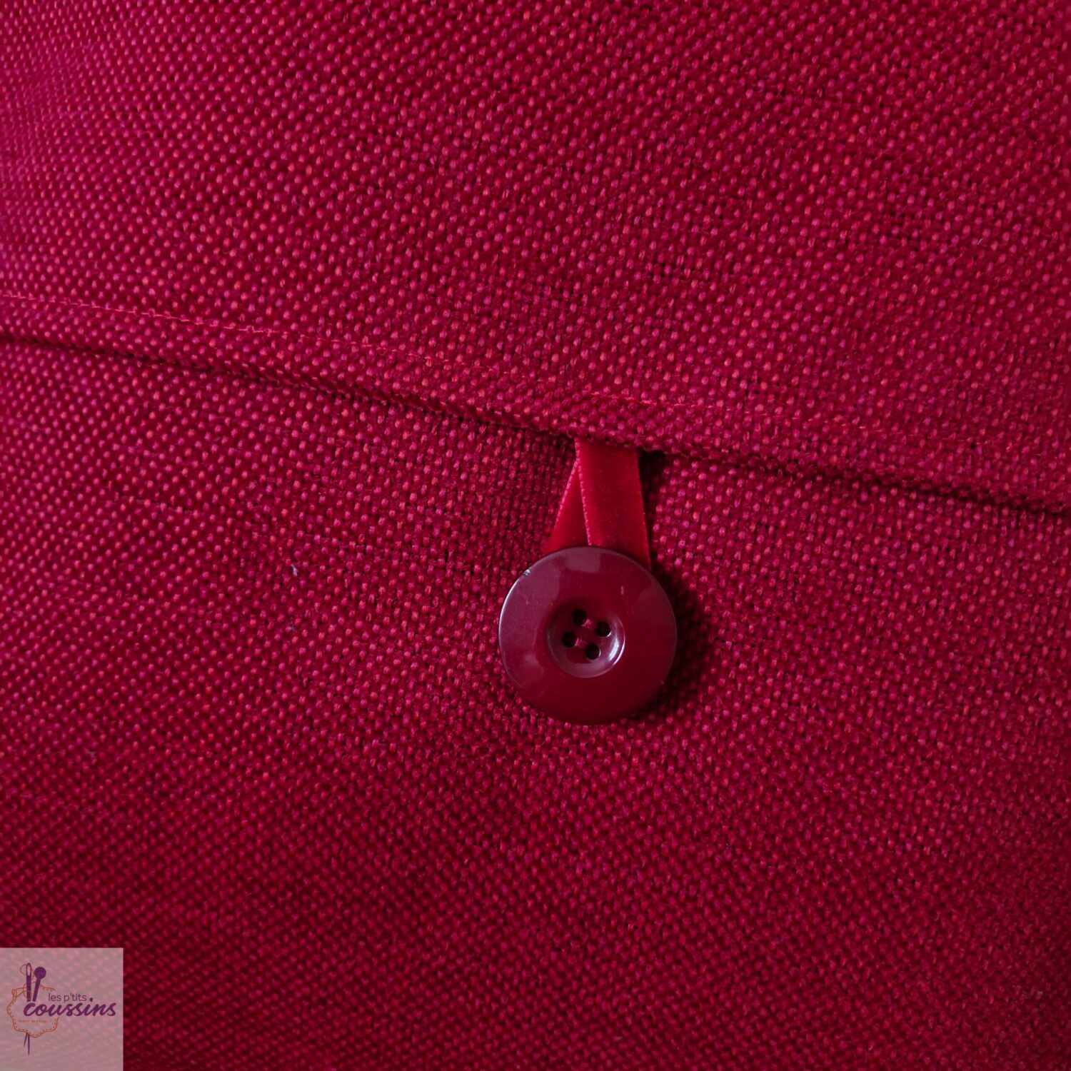 Coussin uni rouge foncé en tissu tissé effet velours tout doux. La housse est en fermeture portefeuille avec un bouton assorti.