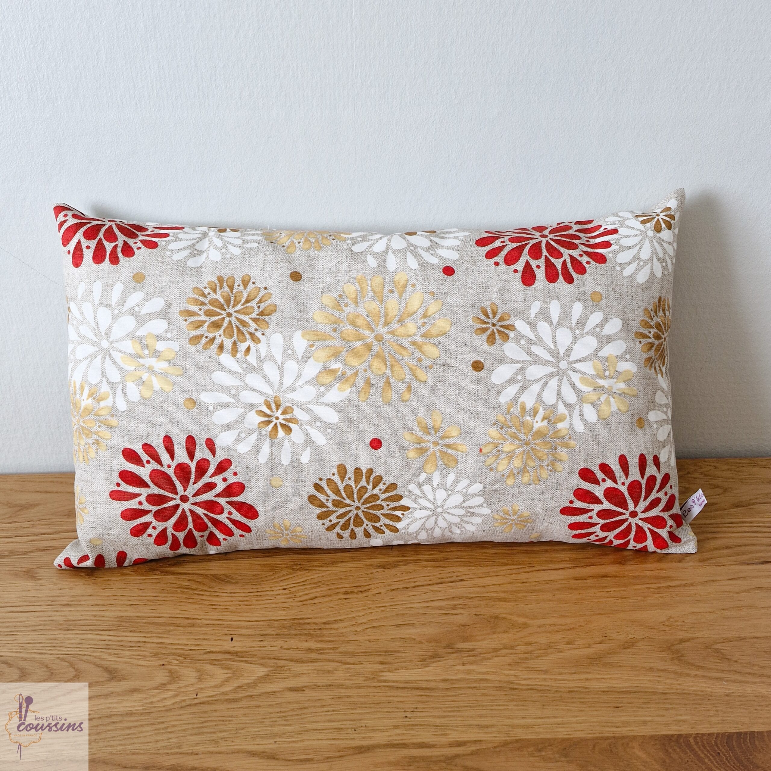 Coussin aux motifs géométriques style goutte d’eau en rouge, blanc et beige sur fond couleur lin.