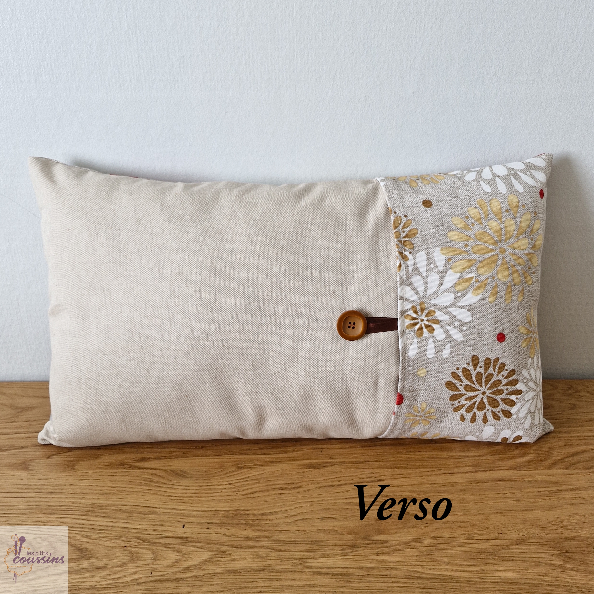 Le dos des housses est en partie uni de couleur lin et fermé par un bouton assorti.