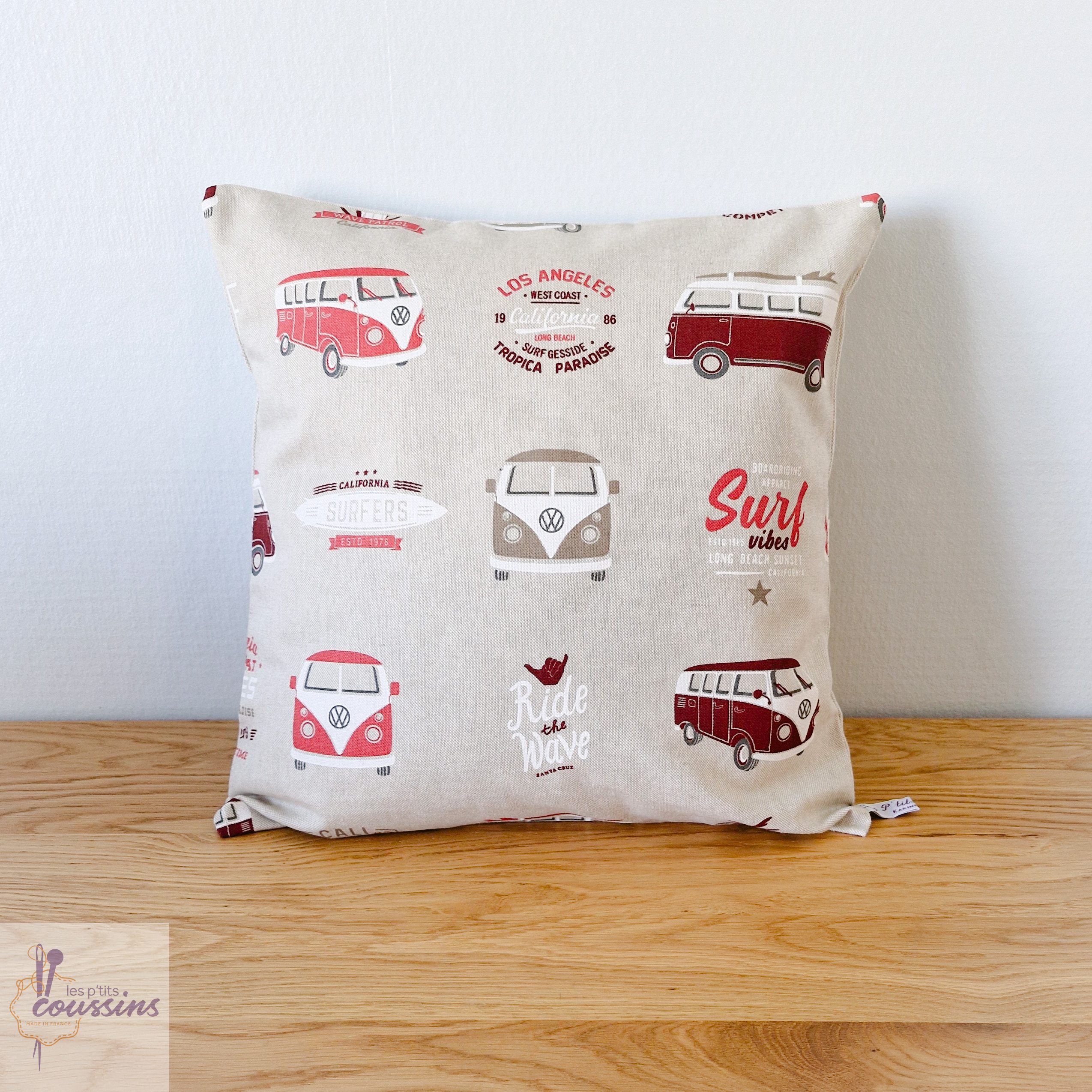 Coussin aux motifs de combi rouge et beige, écusson surf vintage, décoration hippie vintage.